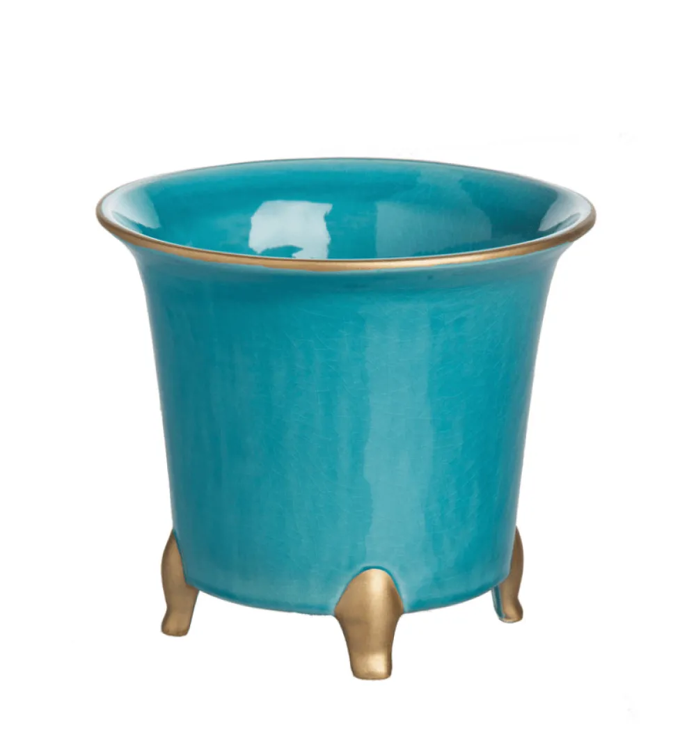 A turquoise cachepot adds the perfect pop of color to any home. Gilded with just a touch of gold to dress it up!