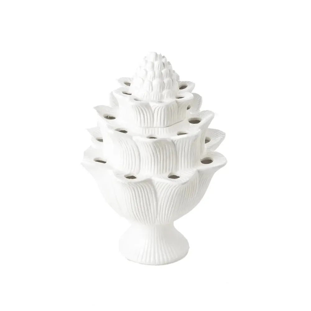 Always a favorite this artichoke leaf tulipiere makes flower arranging easy. Two tiers of leaves create the openings for tulips or any favorite flowers. Removable cap allows for easy cleaning. The crisp, bright white gives a fresh, look anywhere, any time of year.