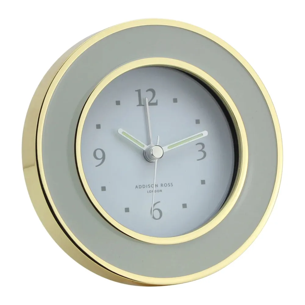 Chiffon enamel is finished in gold with a luxury dove grey velvet back. This beautiful desk or bedside round clock has an alarm and requires an AA battery. The movement is encased within a removable gold cover, and comes with 2 screw in legs.