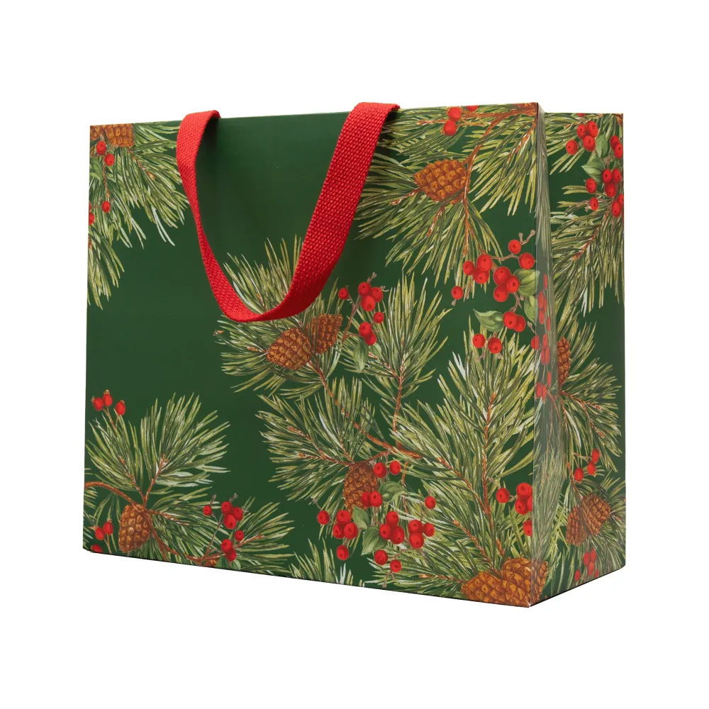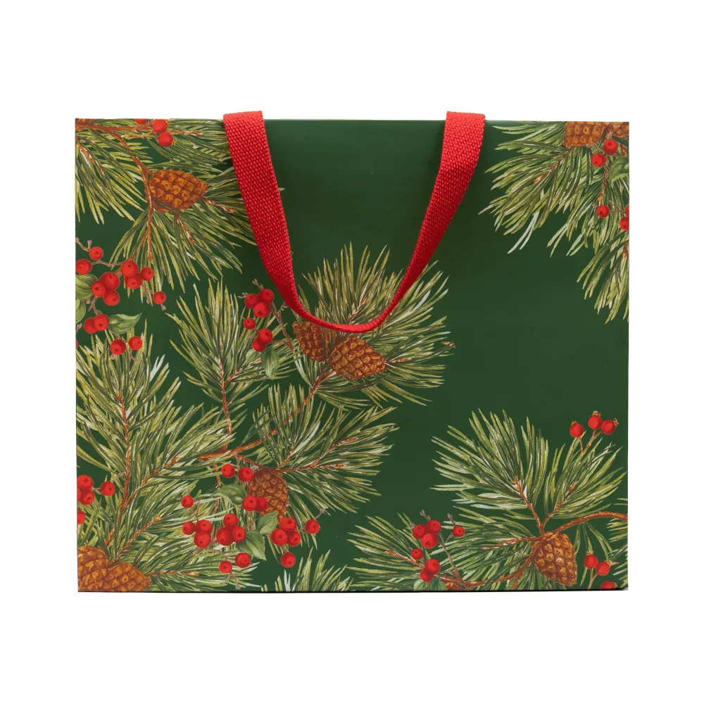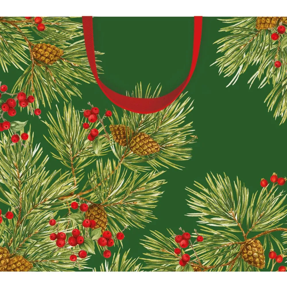 Caspari Christmas Gift & Bottle Bags|Evergreen And Berries Dark Green Gift Bags - includes 1 Gift Bags