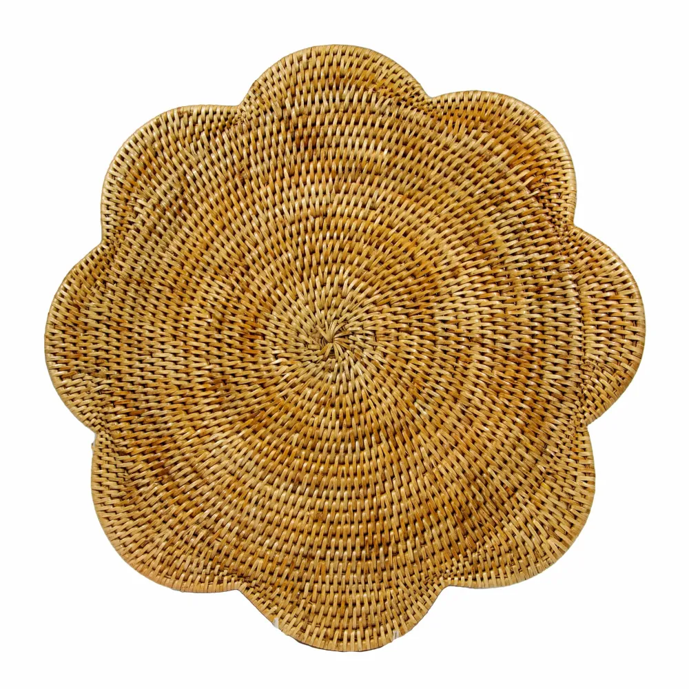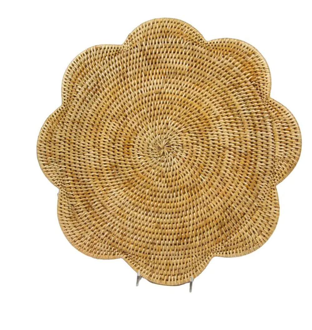 Caspari Rattan Trays And Accessories|Paper Placemats|Rattan Scalloped Round Placemat in Honey – 1 Placemat