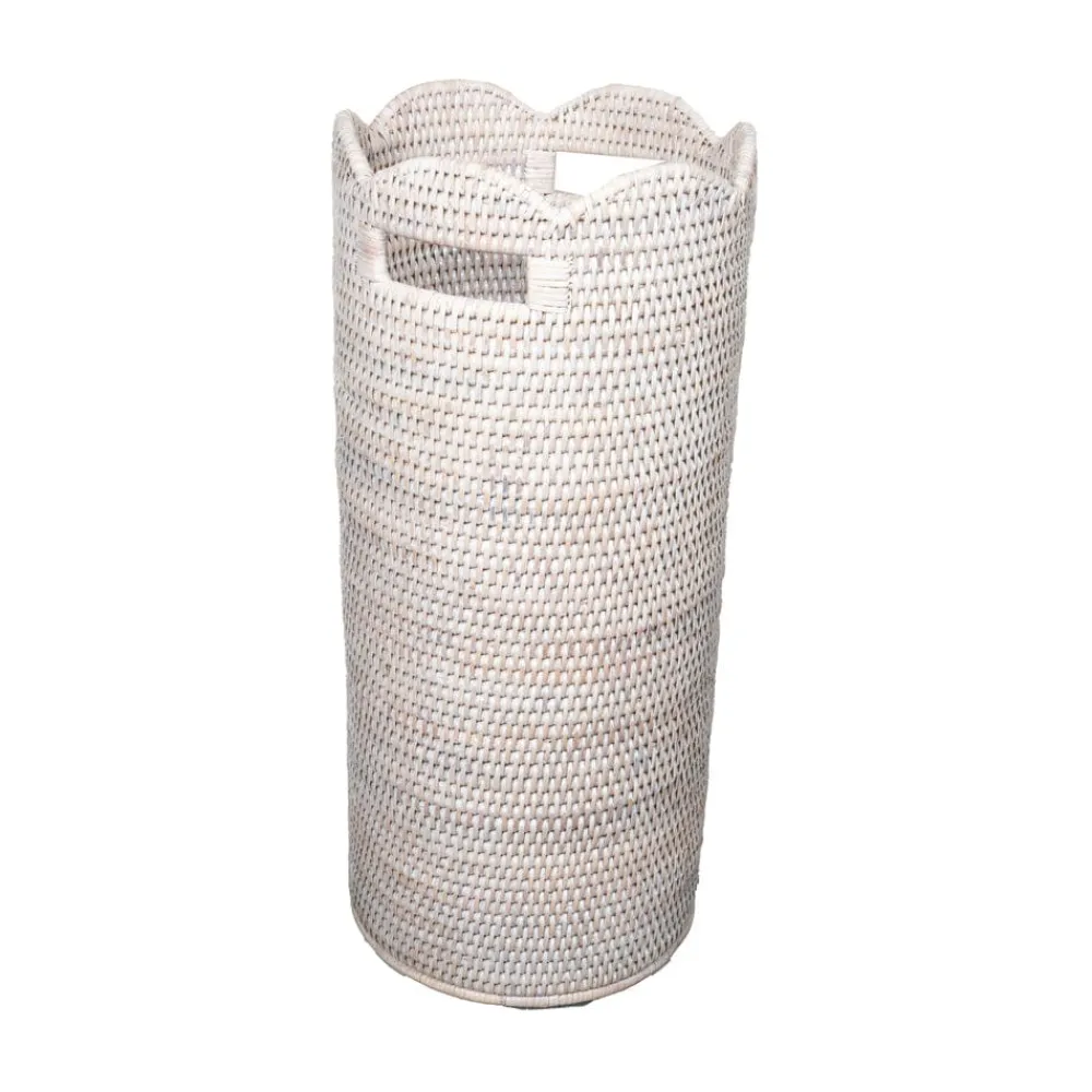 Handwoven from fast growing, sustainable rattan, our rattan accessories bring a timeless texture and warmth to the home. The Scalloped Rattan Umbrella Stand features a charming scalloped rim, handle openings, and comes with a metal bucket insert to catch drips. The perfect way to add a little zing to your entryway!