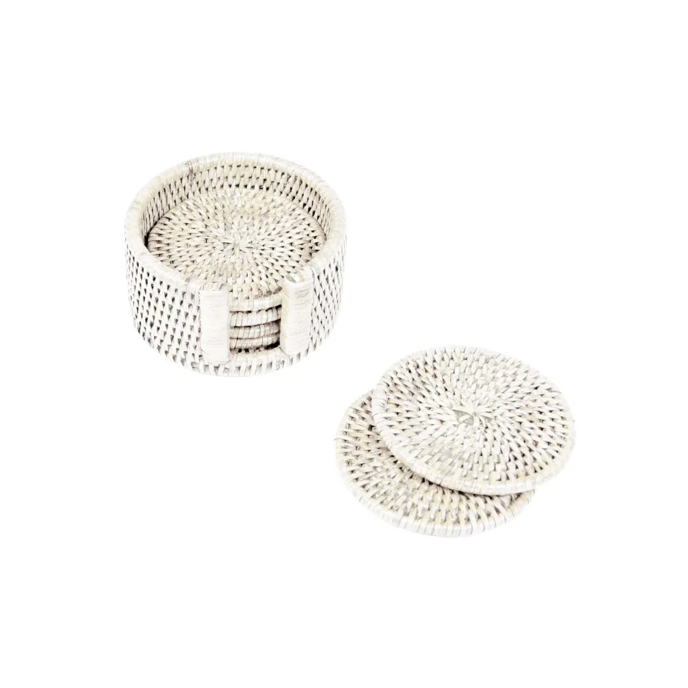Caspari Summer Picnic|Cocktail Party|Rattan Round Coaster and Holder Set in Cream – Set of 6 Coasters and 1 Napkin Holder