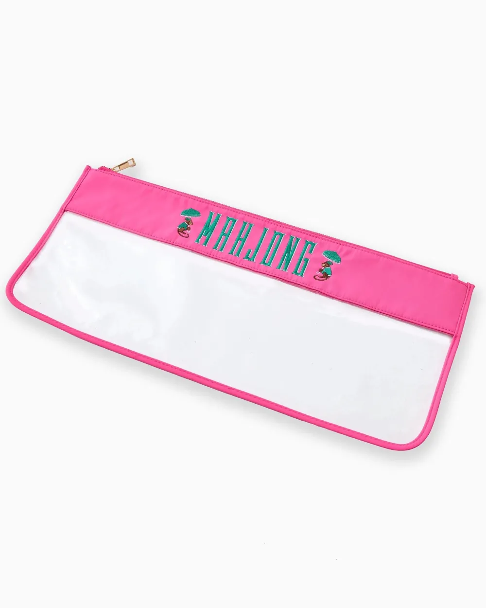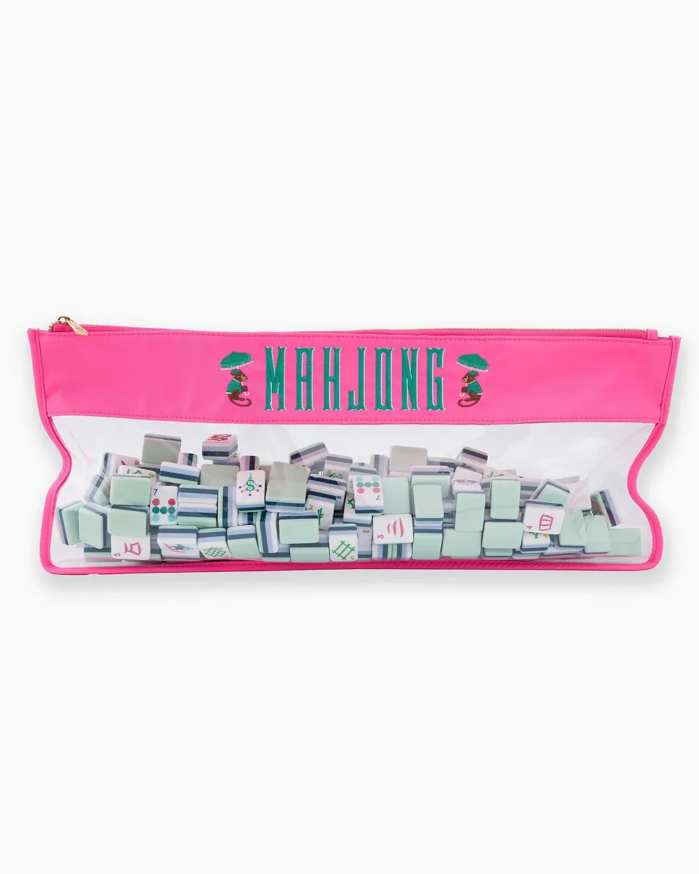 Get ready to mahj in style with the Pink Monkey Zippered Bag! In a bold neon pink with vibrant rich teal embroidery, this playful bag is framed by two adorable matching monkeys, adding a fun, cheeky vibe to your game night. It’s as functional as it is fabulous, with a spacious interior, secure zipper closure, and a clear bottom section to show off your tiles in style. Perfect for those who love to make a statement while keeping their game essentials safe and sound!Â