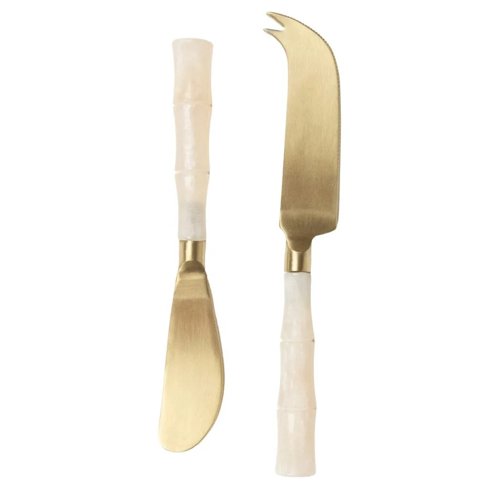 Dress your cheese board or down with our stylized Bamboo Flatware Set. Featuring a brushed gold finish and warm pearl color handle, this versatile flatware complements any table setting with its classic bamboo styling. Each 2-piece set includes a cheese knife and spreader.
