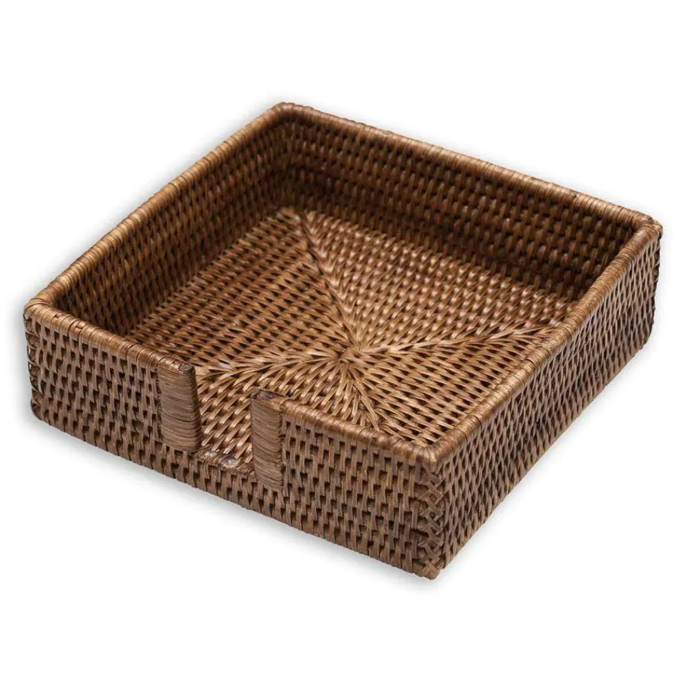 Perfectly sized to hold Caspari paper and paper linen napkins, our napkin holders are an easy addition to your tabletop décor. They are a perfect way to keep napkins neatly presented in your dining room, on your coffee table, kitchen counter, or in a guest bath. The designs in our rattan collection feature a durable double-weave and handcrafted charm. Constructed from naturally fast-growing rattan, these reusable pieces add an element of eco-friendly style to your tabletop. Each napkin holder can hold up to 2 packs of Caspari napkins and coordinate well with most of our existing designs and colors.