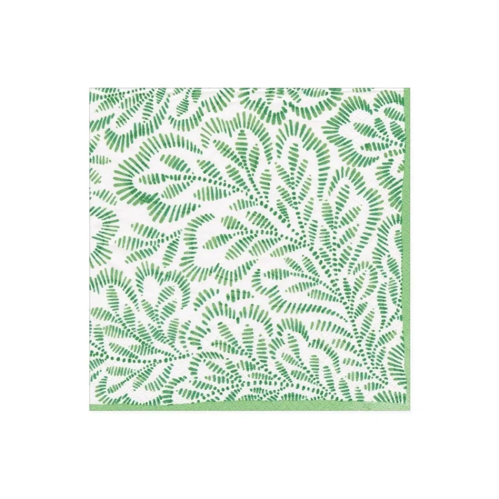 Caspari Paper Cocktail Napkins|Block Print Leaves Paper Cocktail Napkins in Green - 20 Per Package