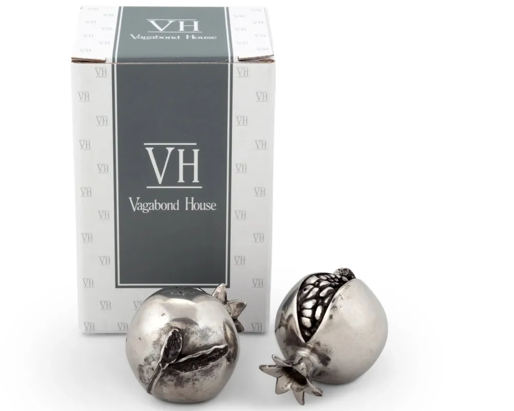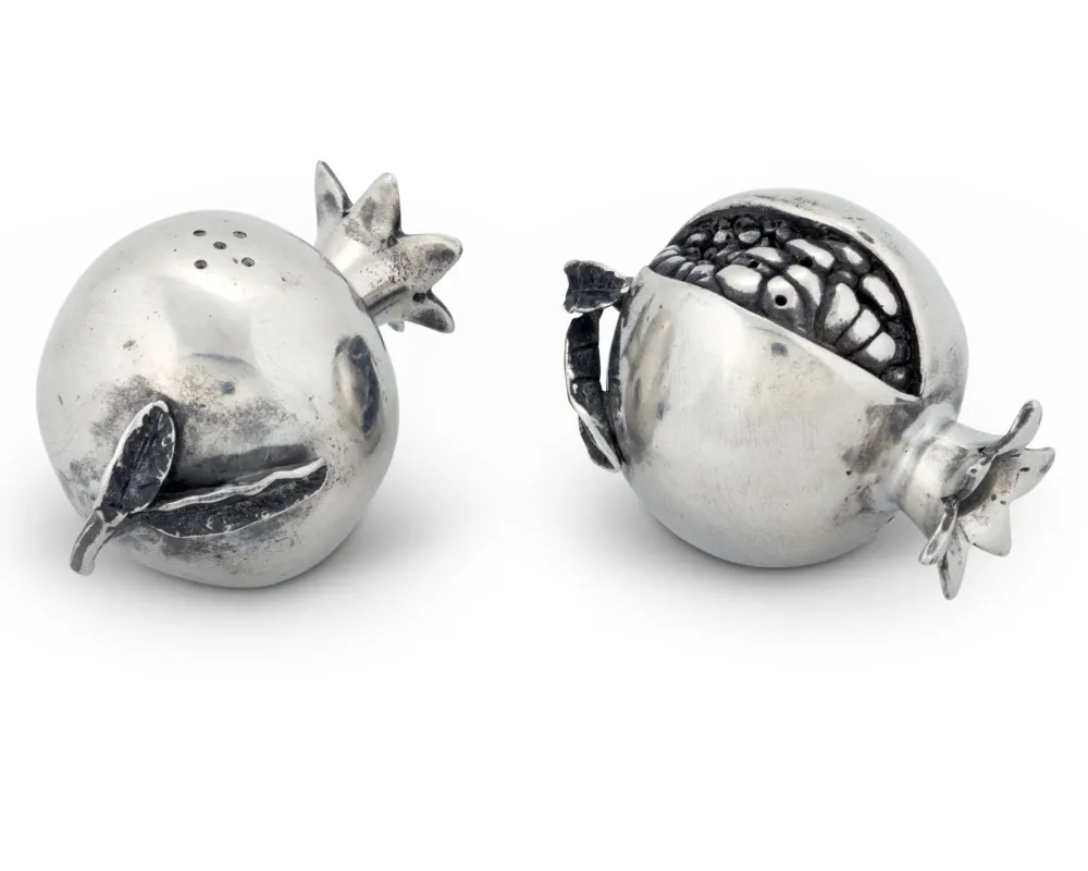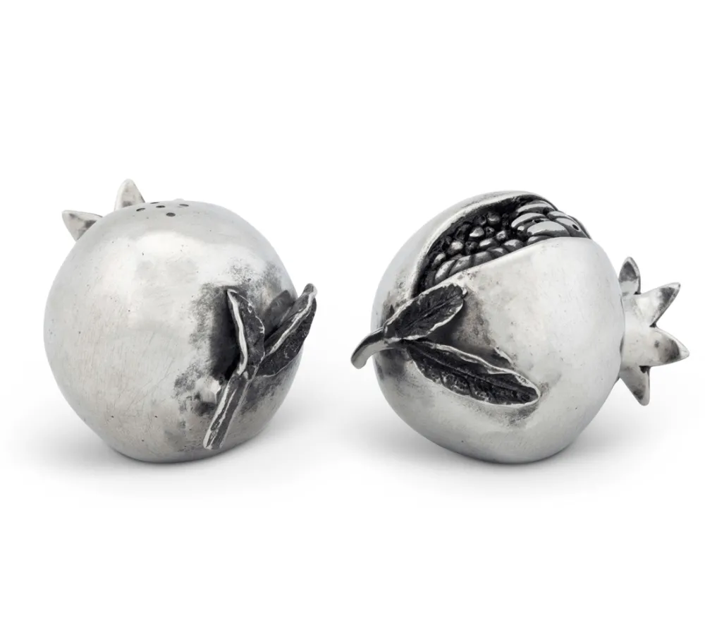 Celebrate the bounty of nature with our Pomegranate Salt and Pepper Set, designed to bring a touch of the garden to your table. Made from premium pewter, this elegant duo showcases two pomegranates adorned with crown-like stems and smooth surfaces. One fruit is artfully split open to display detailed seeds, while the other is accented by a delicately crafted leaf, making this set a stunning and functional addition to your dining experience..
