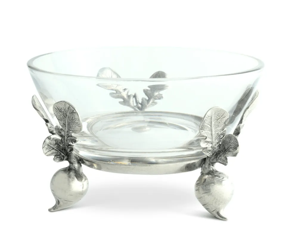 This Radish Dip Bowls present a gently angled, sturdy glass bowl supported by intricately crafted pewter radish-shaped feet, topped with charming radish greens. Perfect for highlighting your inventive appetizers, these bowls are ideal for serving zesty salsas, smooth dips, and delicious snacks.